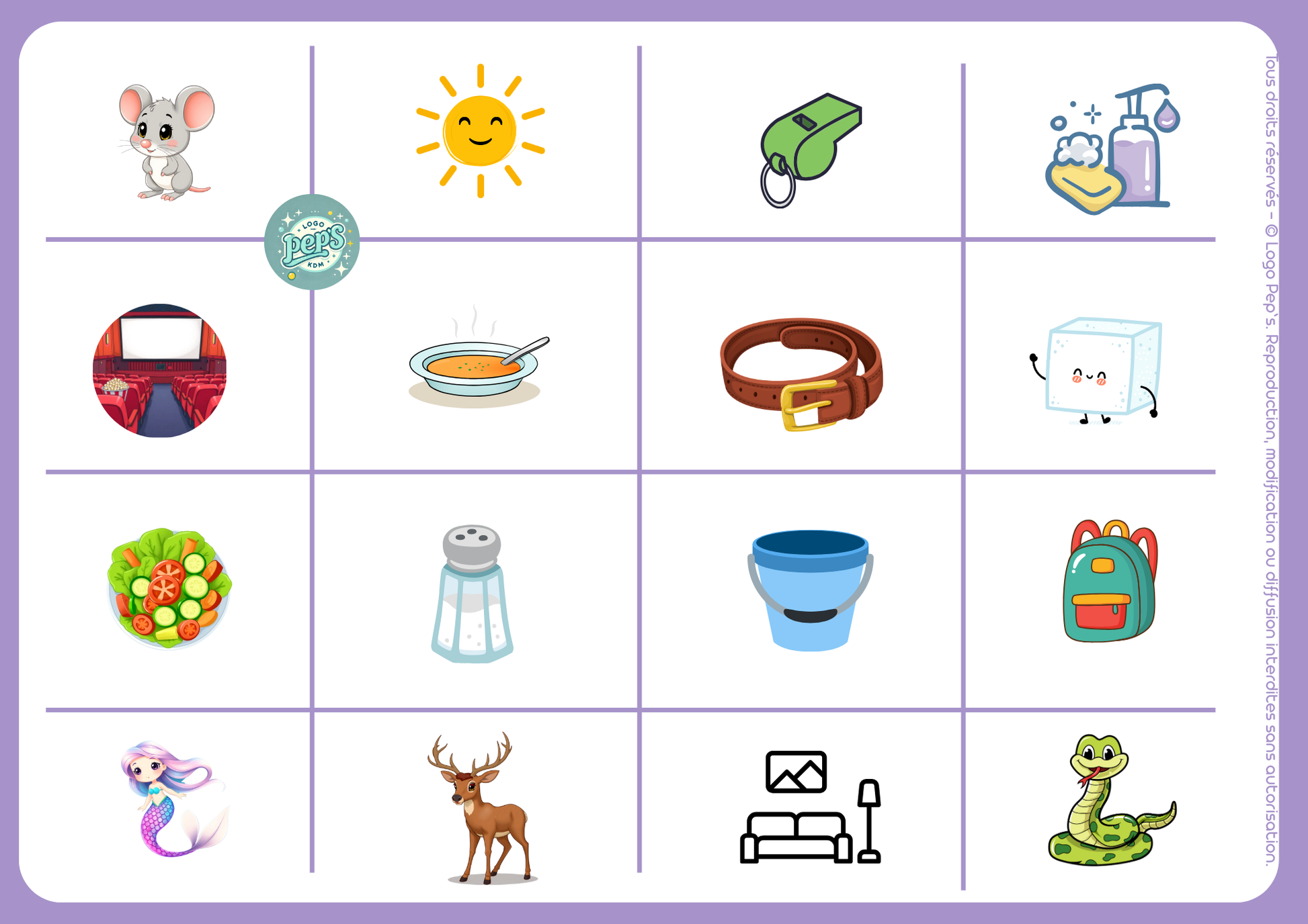 À chaque lancer de dé, l’enfant nomme ou met en phrase un mot contenant /s/. Si la production est réussie, une feuille est coloriée : le terrier est mieux protégé ! Mais attention… si le dé tombe sur 5 ou 6, un flocon descend : l’hiver approche ❄️