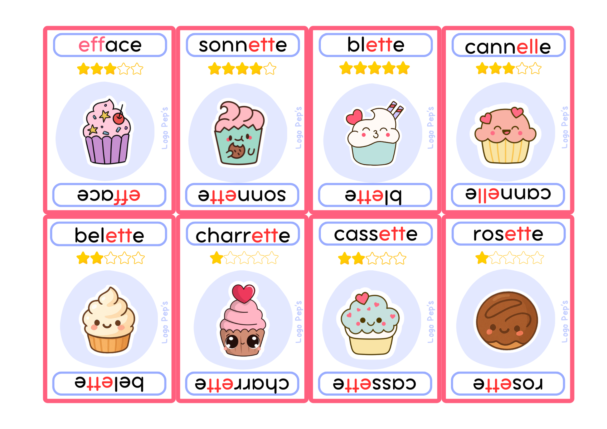 Avec cette bataille de 50 cartes, les enfants lisent, comparent et répètent des mots contenant le son è formé par e + doubles consonnes (ex : effet, elle, terre, colle…).