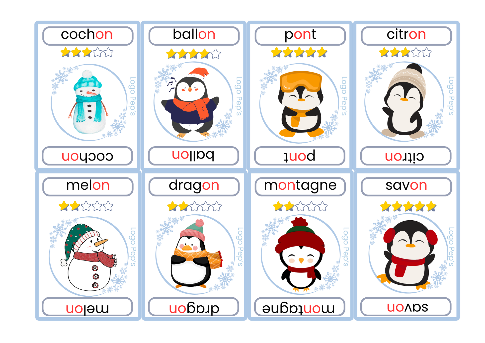 Avec cette bataille de 50 cartes, les enfants découvrent, lisent et comparent des mots contenant le son ON (pont, rond, lion, bonbon, ballon…).