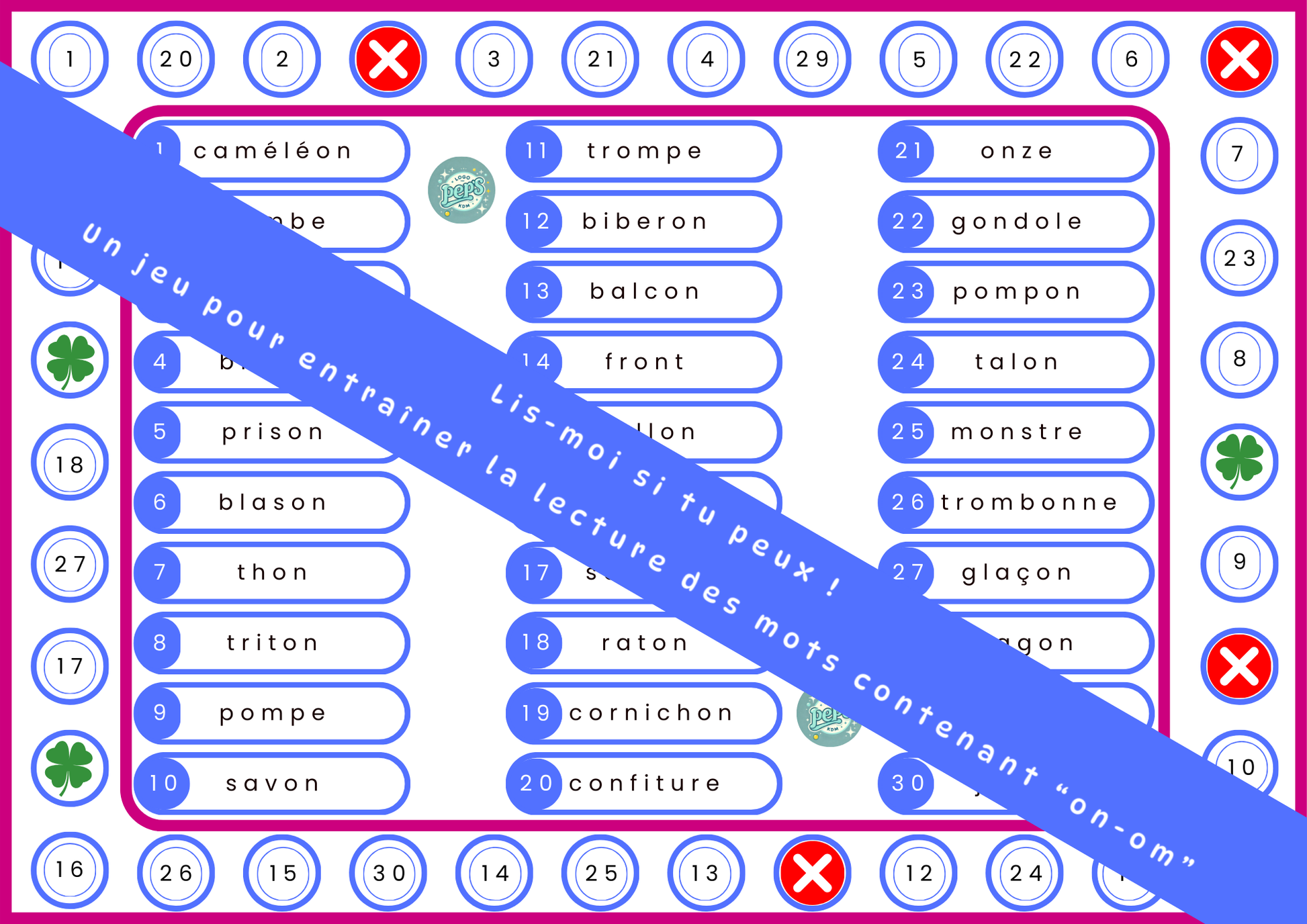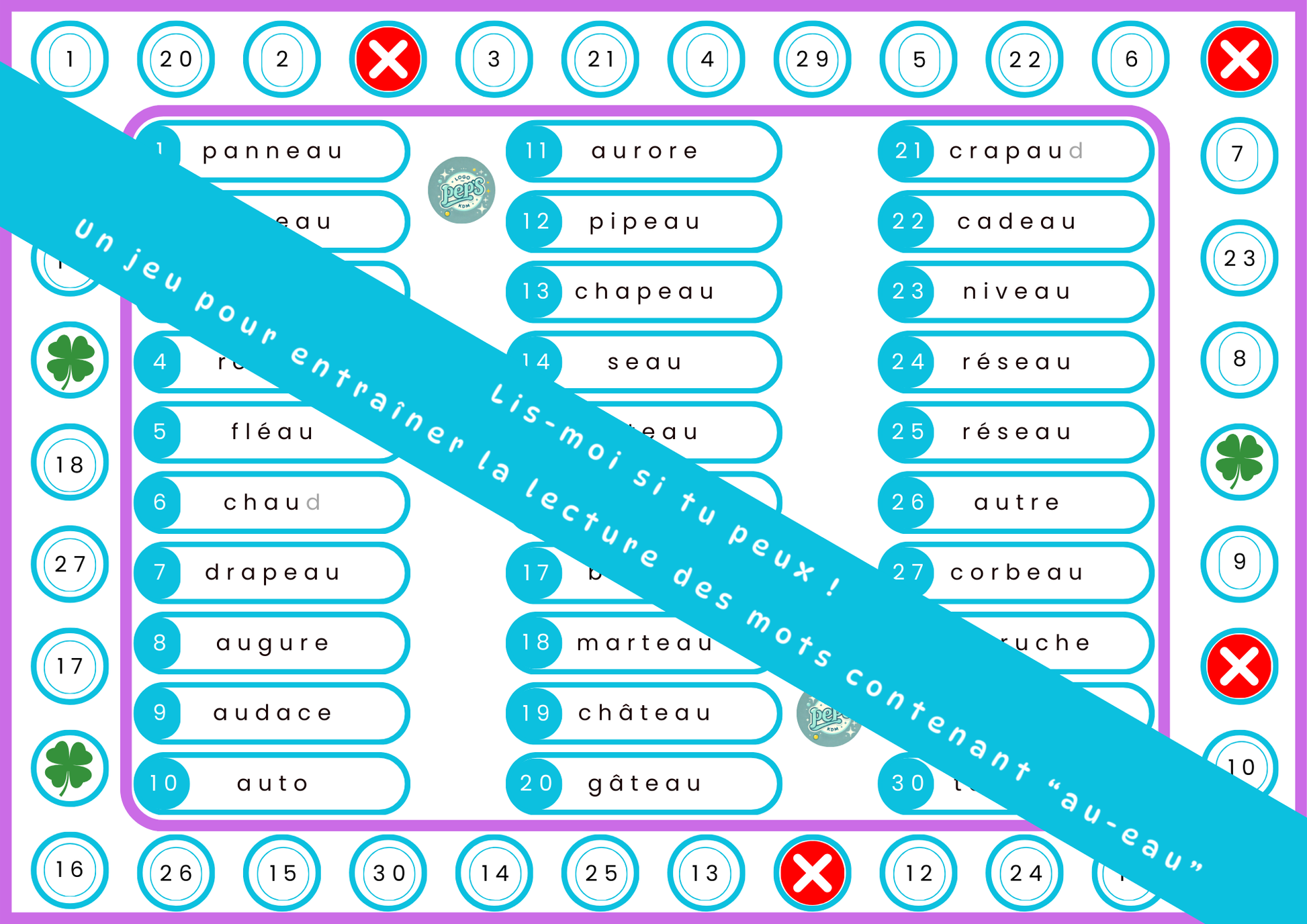L'enfant lit les mots proposés sur le plateau et avance selon sa réussite (ou selon la variante choisie).
