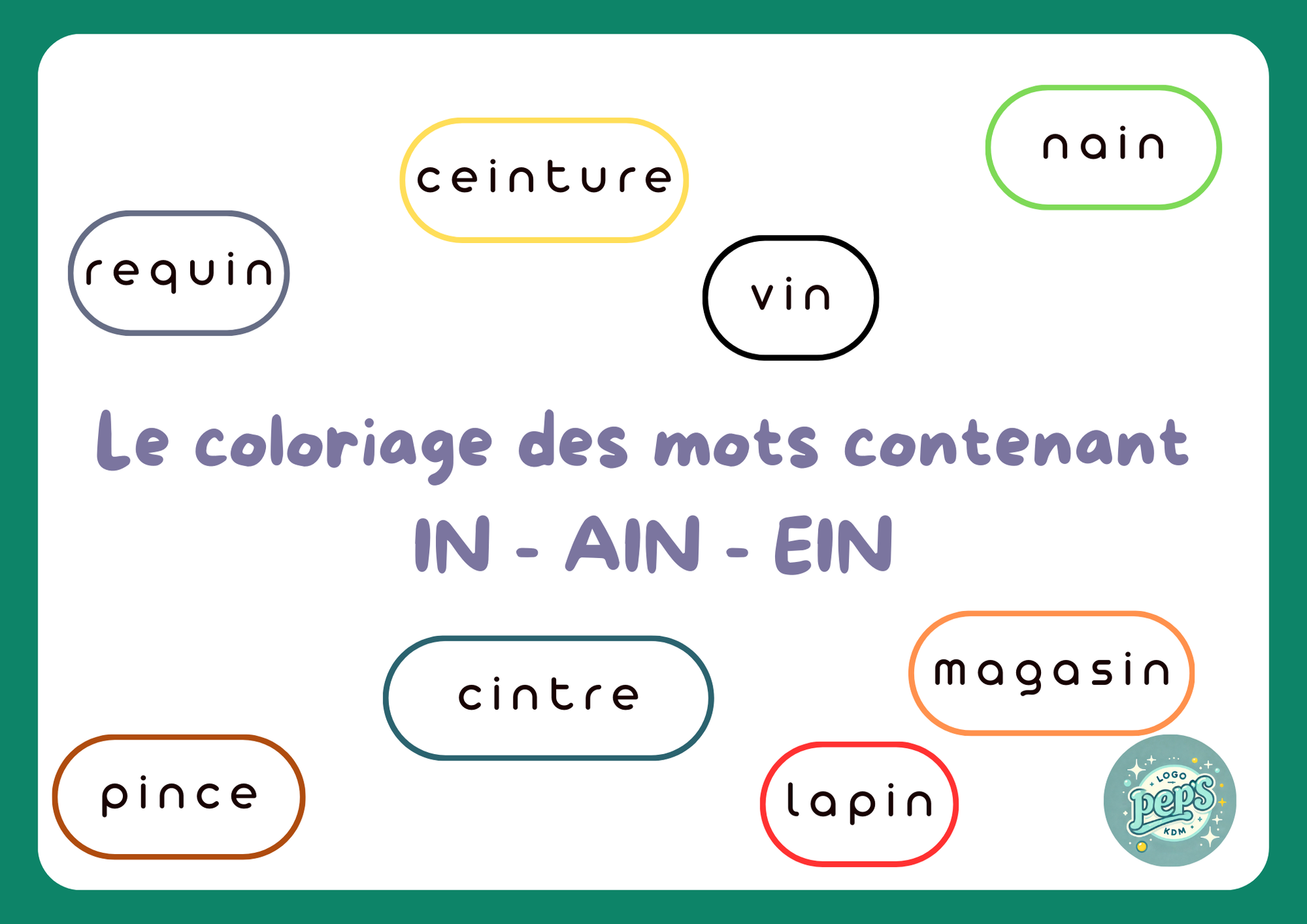 Un coloriage ludique pour automatiser les sons IN / AIN / EIN et renforcer la compréhension des mots grâce à l’association mot → image.