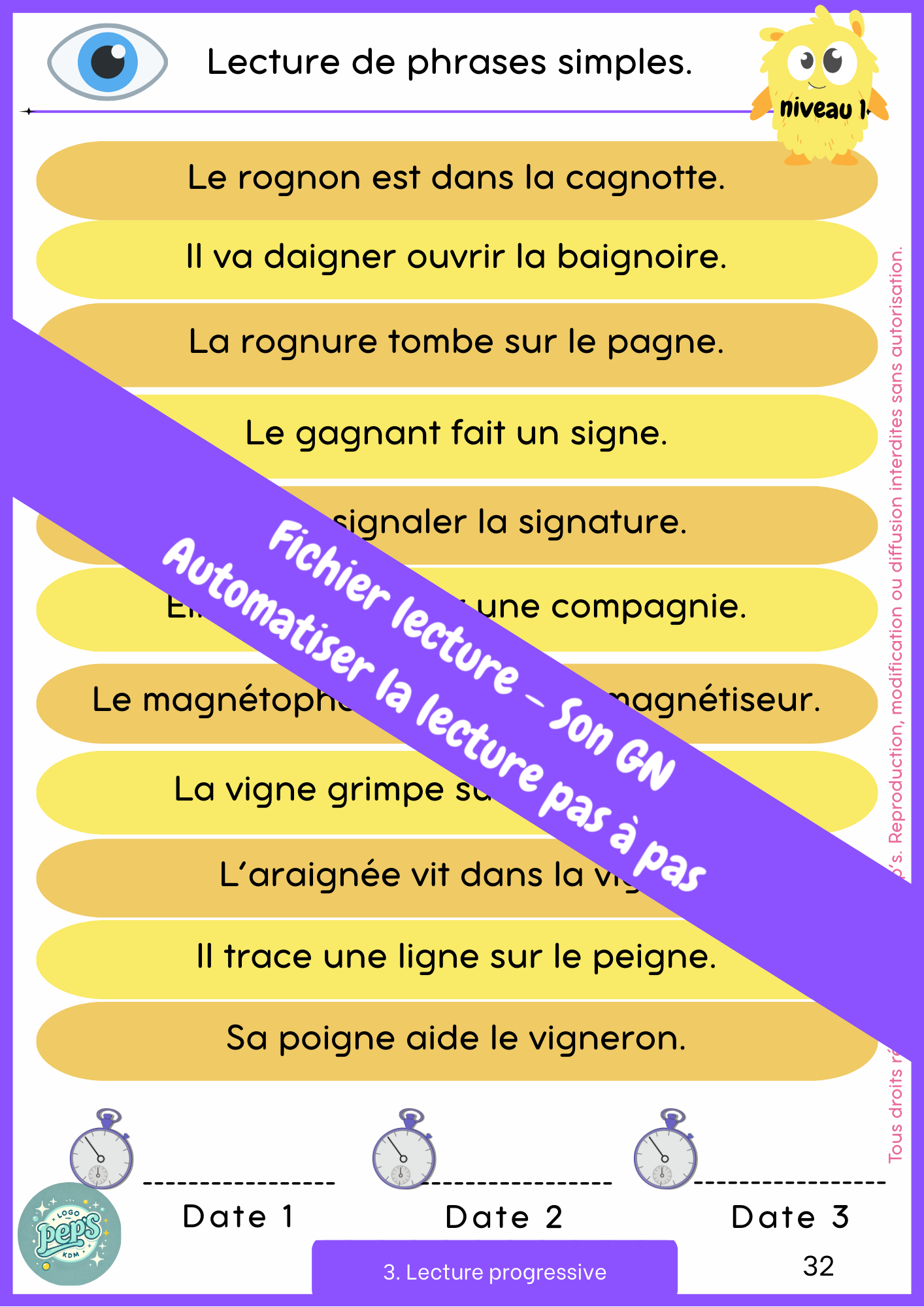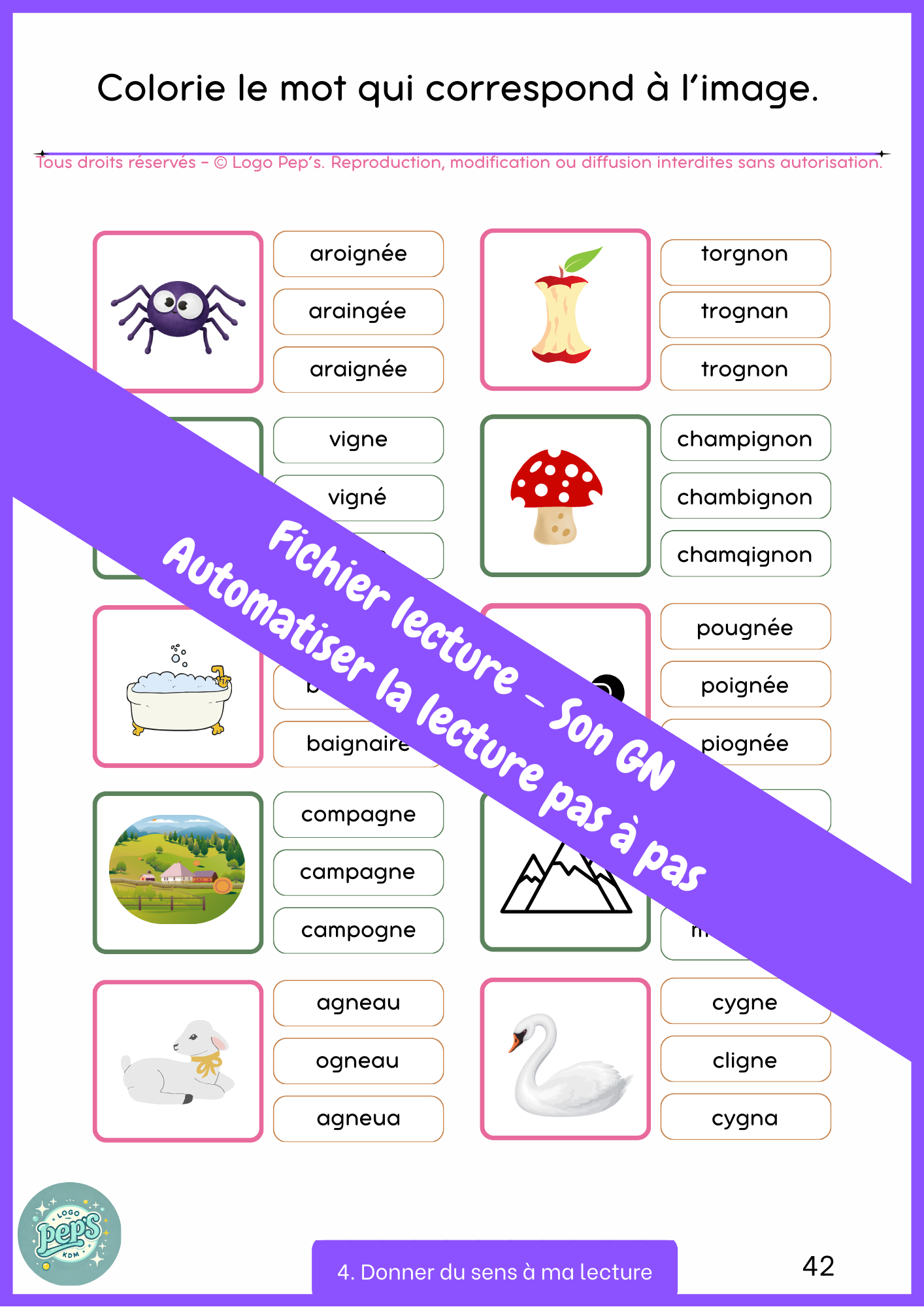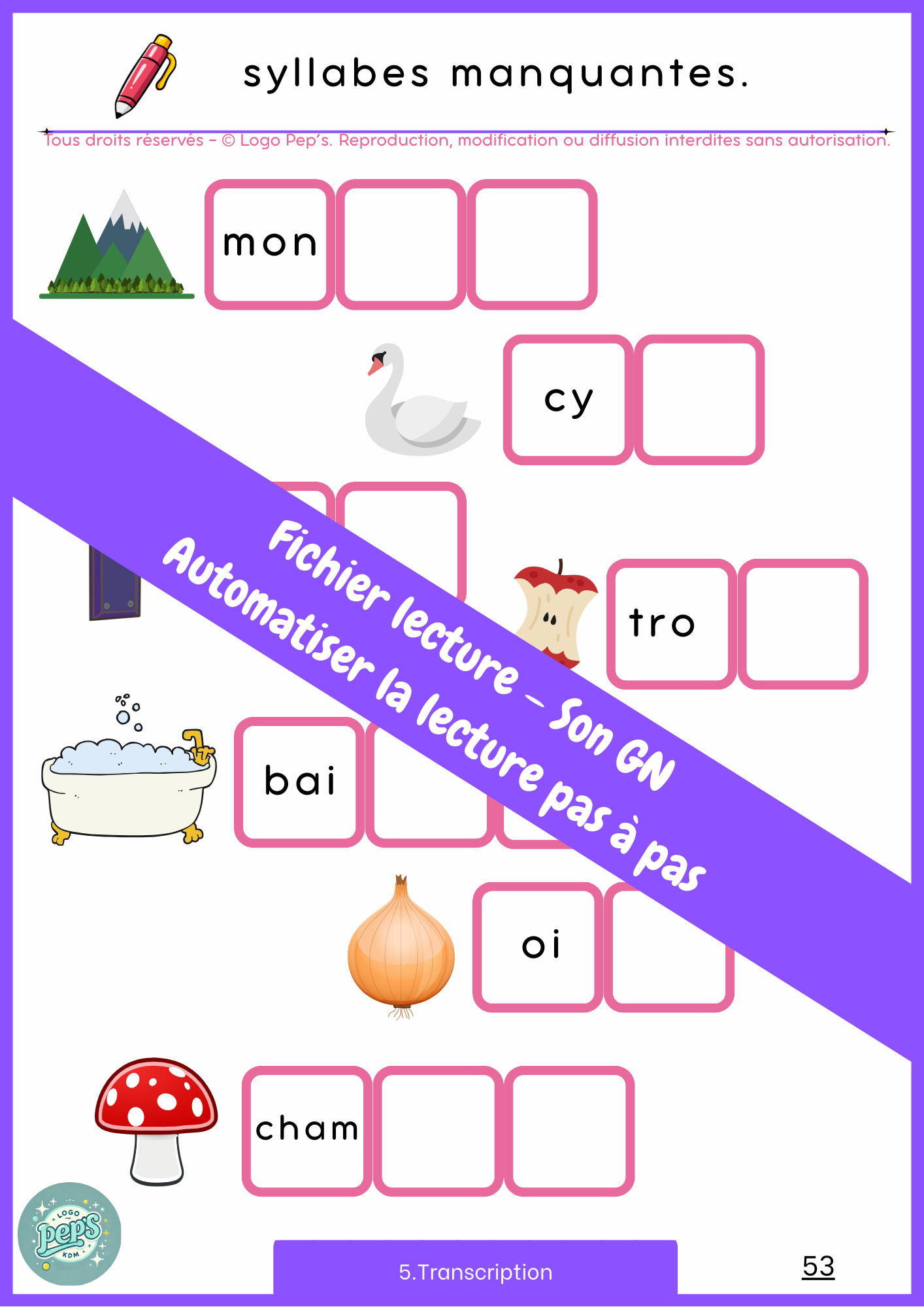 Ce fichier de 58 pages propose une progression structurée et motivante autour du son GN pour aider l'enfant à le lire avec précision, fluidité et confiance.