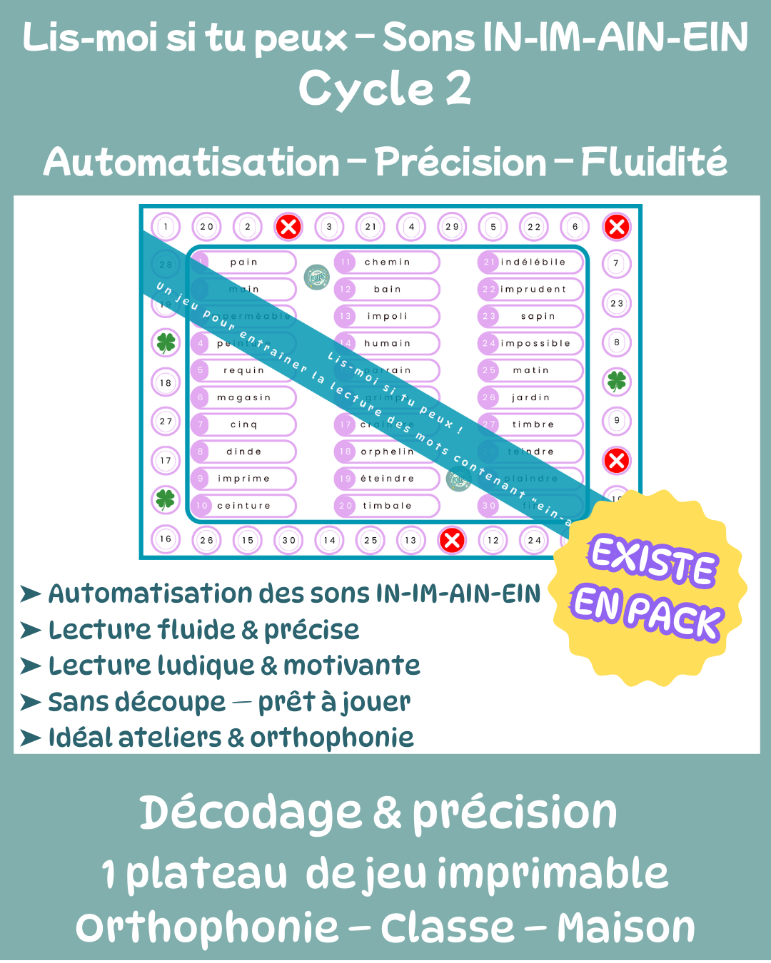Un jeu de lecture ludique, stratégique et ultra-ciblé pour automatiser la lecture des mots contenant IN – AIN – EIN – IM tout en s’amusant !
