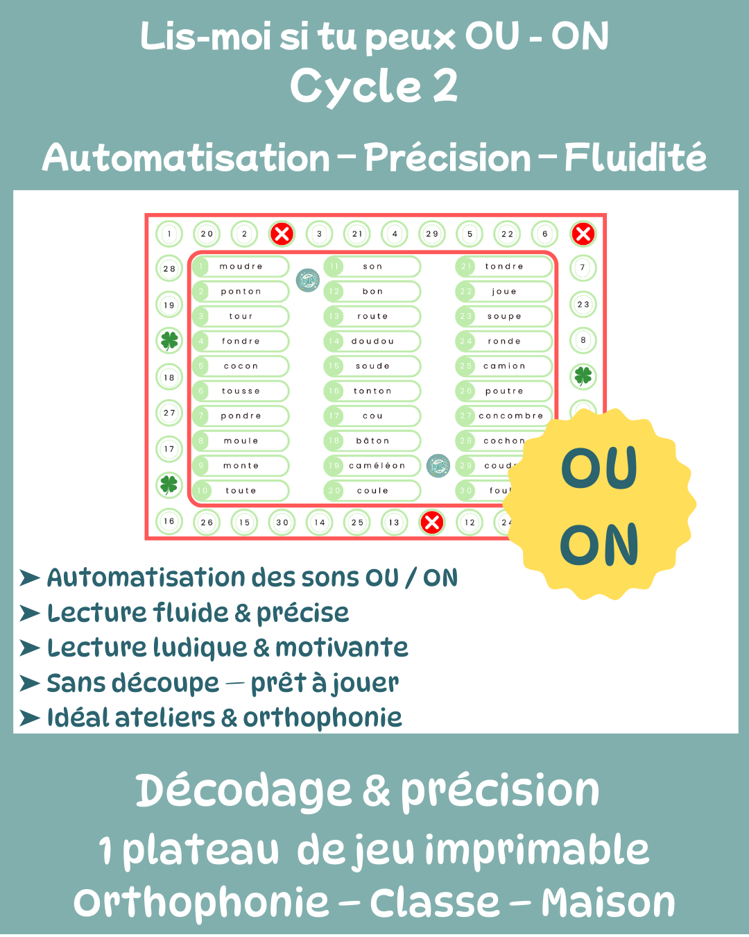 Un jeu de lecture ludique, stratégique et ultra-ciblé pour aider les enfants à différencier et automatiser les graphies OU et ON tout en s’amusant.