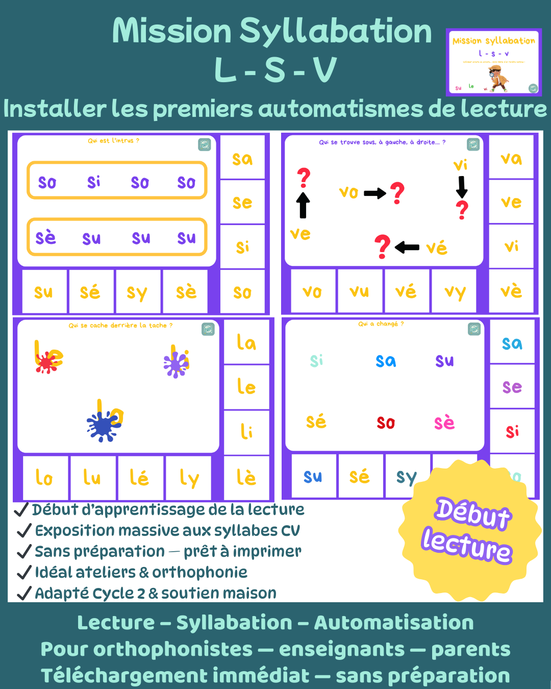 Mission syllabation est une collection pensée pour accompagner les enfants en tout début d’apprentissage de la lecture, en leur proposant un entraînement intensif mais ludique à la reconnaissance des syllabes simples de type consonne + voyelle (CV).