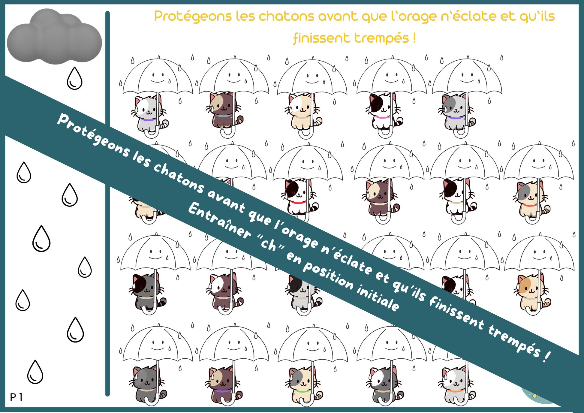 L’enfant choisit un chaton, retrouve la même image sur l’autre planche, prononce le mot associé puis lance le dé pour savoir s’il peut protéger le chaton… ou s’il faut colorier une goutte de pluie.