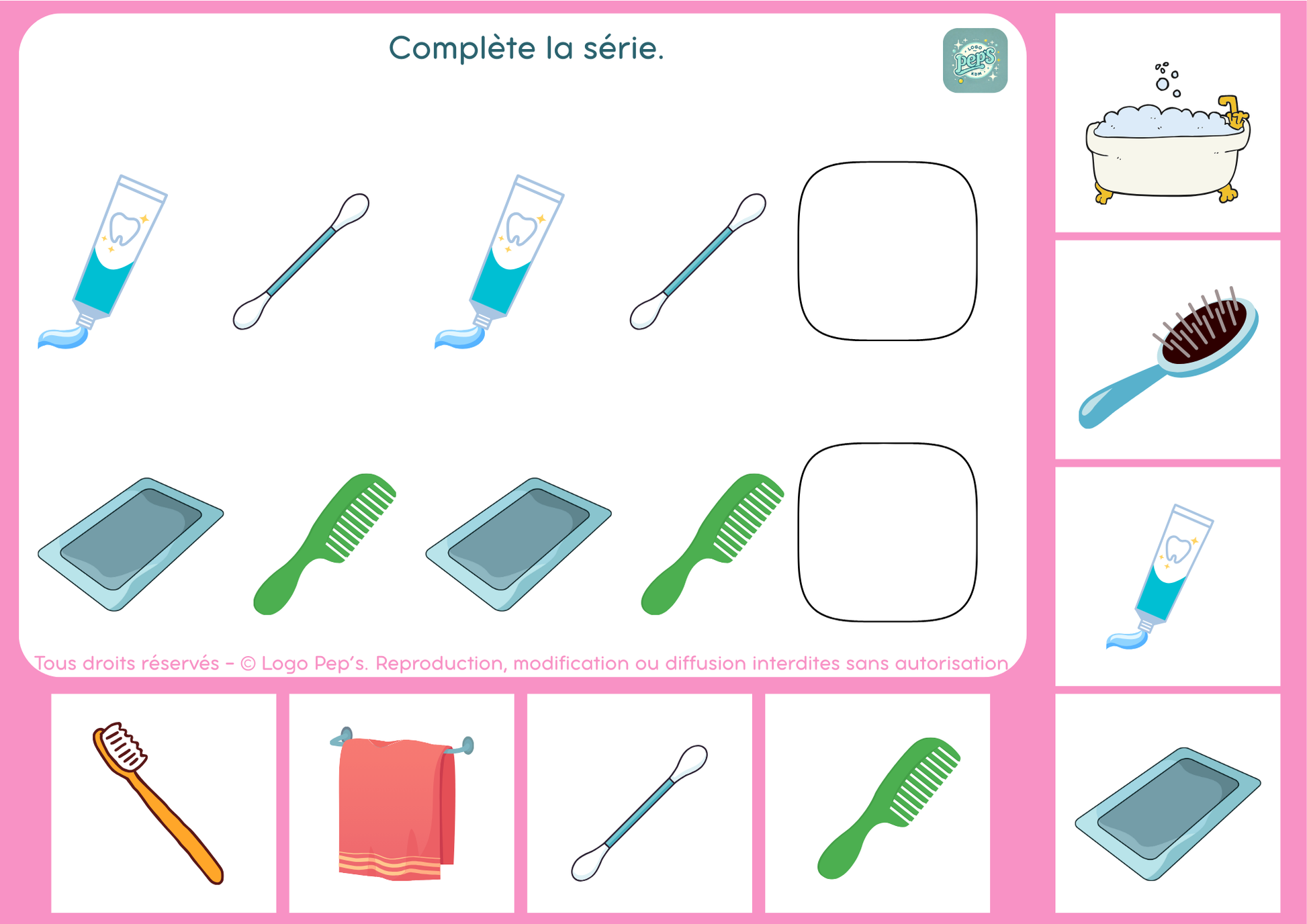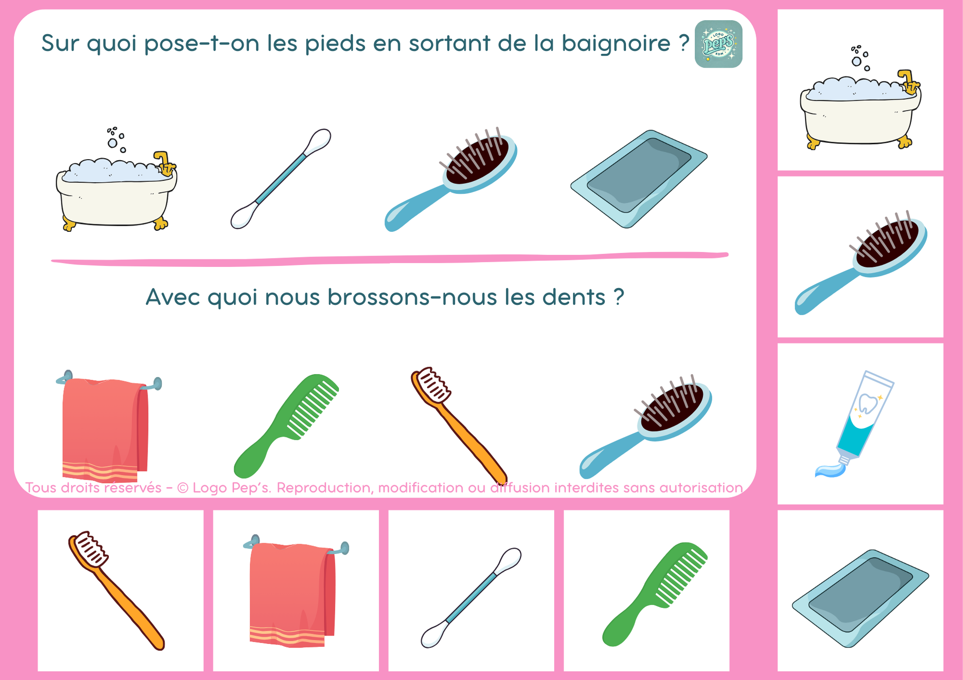 Ce dossier de 80 pages propose des activités visuelles variées pour explorer les objets, les actions, les produits d’hygiène, les espaces, et les routines, tout en mobilisant la formulation et la structuration du lexique.