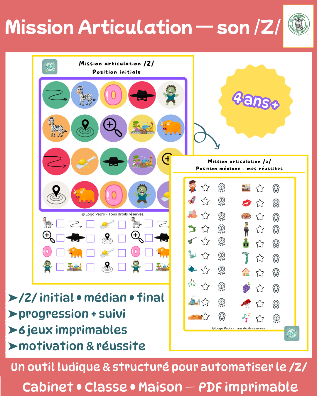 Ce fichier aide l’enfant à produire le son /z/ dans différents contextes, tout en soutenant la répétition, l’engagement et la valorisation des réussites.